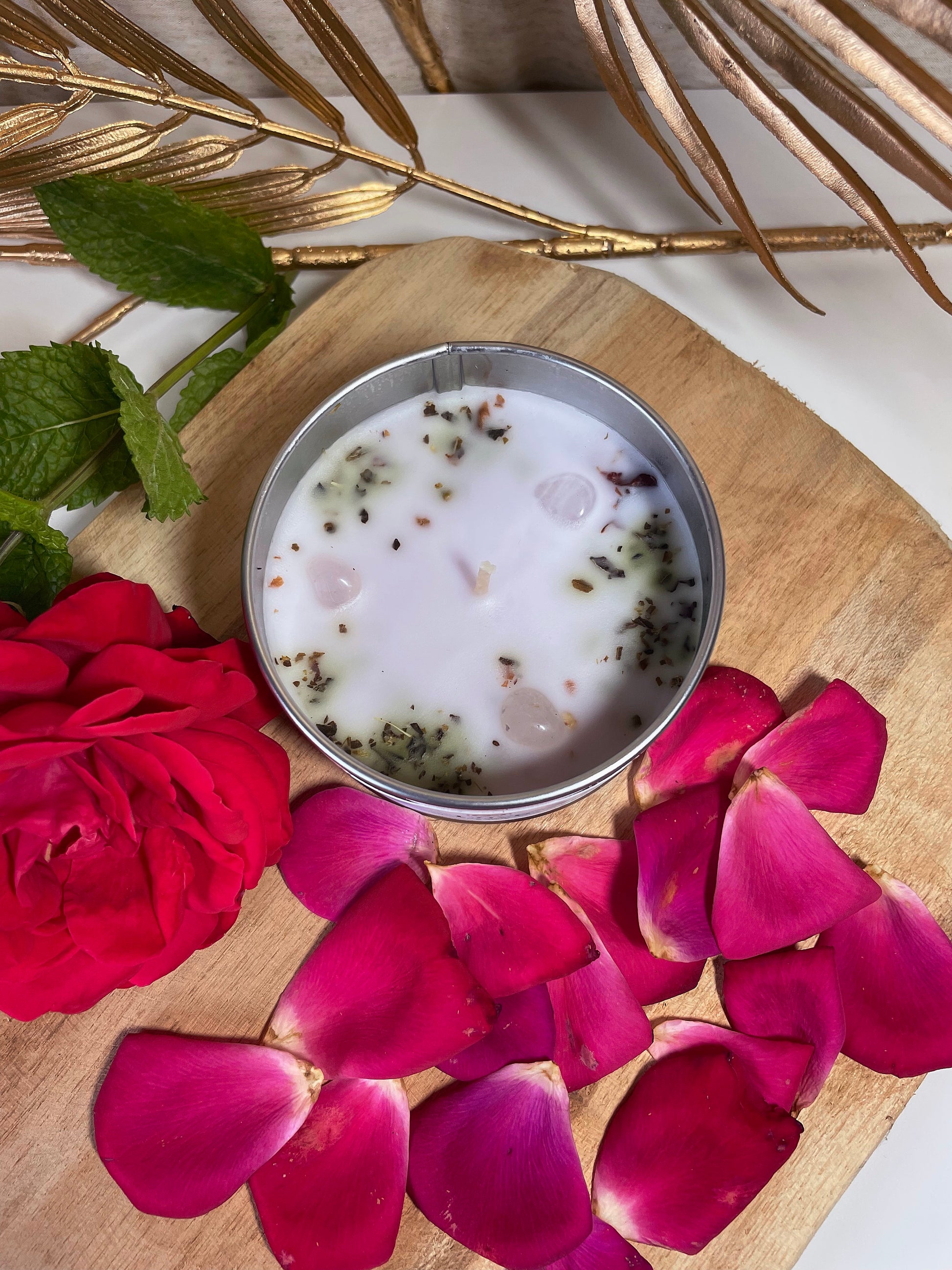 Bougie unique et fabriquée à la main, incrustée de minéraux et fleurs séchées. Paraffine de haute qualité et mèche en bois.