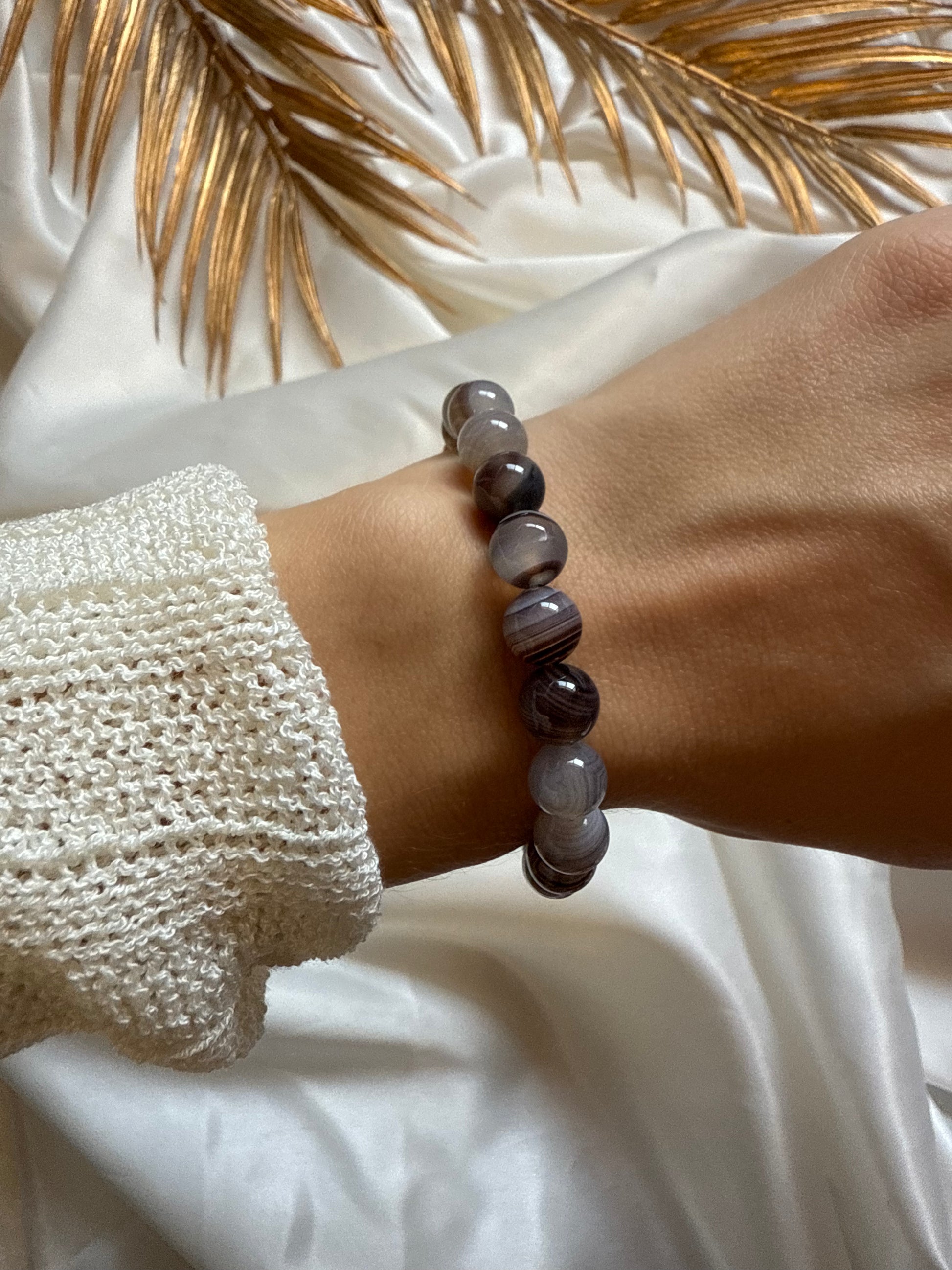 Originaire du sud de l’Afrique, l’agate du Botswana incarne l’introspection, la stabilité et l’harmonie. Elle est souvent associée au chakra du troisième œil, et représente la capacité à voir au-delà des apparences, favorisant un ancrage émotionnel profond.