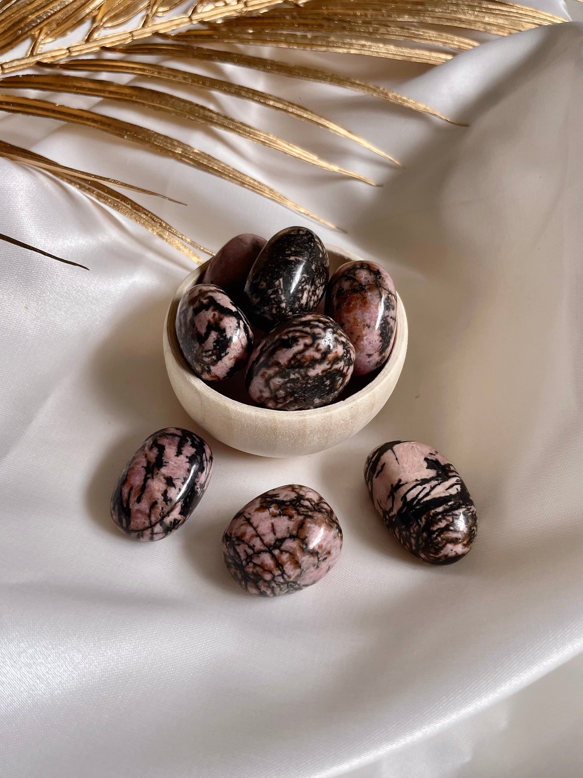 Pierre de coeur, la rhodonite incarne la connexion à l'amour universel, la passion, le réconfort et l'apaisement. Ses inclusions noires rappellent l'enraciment et son doux rose évoque l'éveil de l'enfant intérieur. Ses diverses contrastes illustrent également la vitalité et la force.